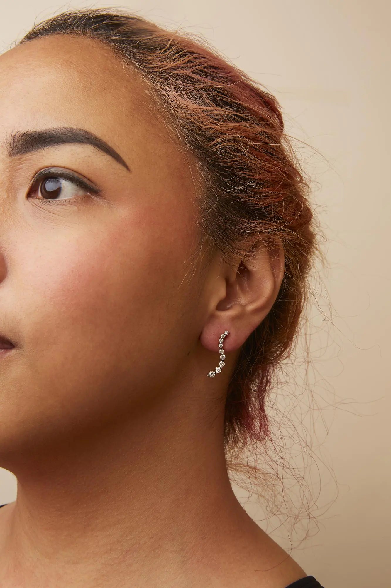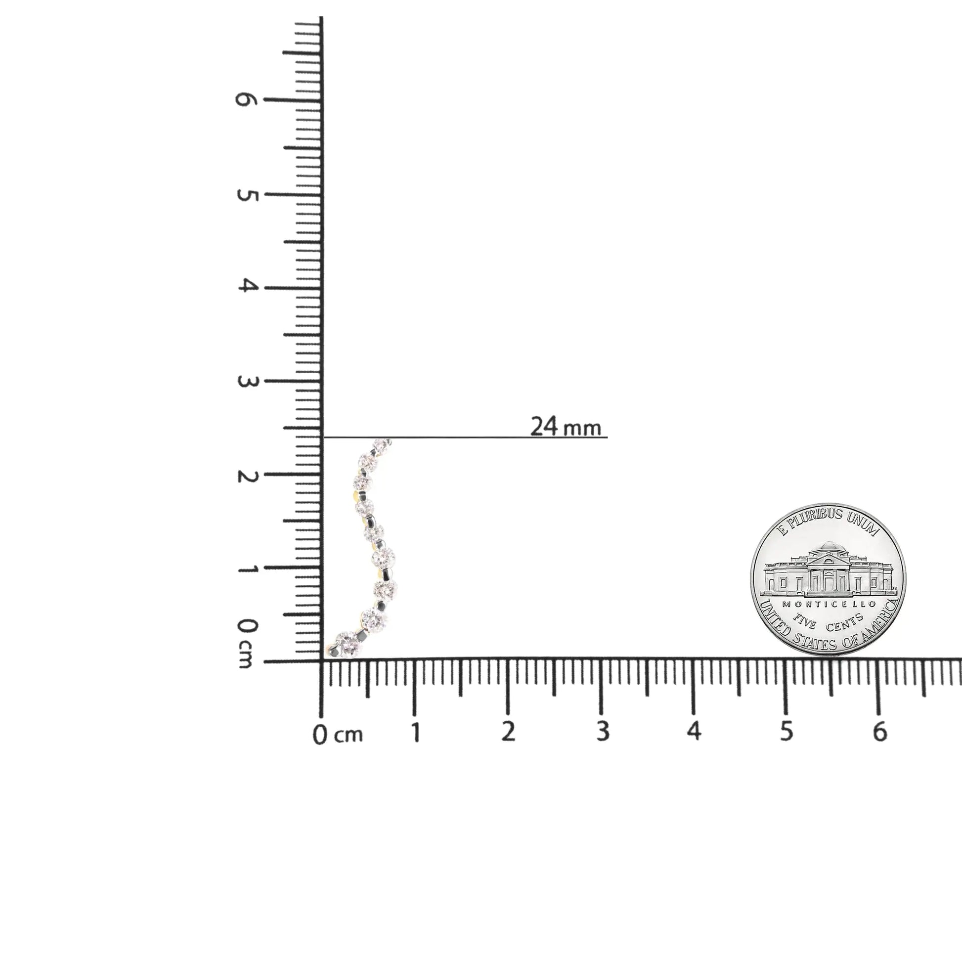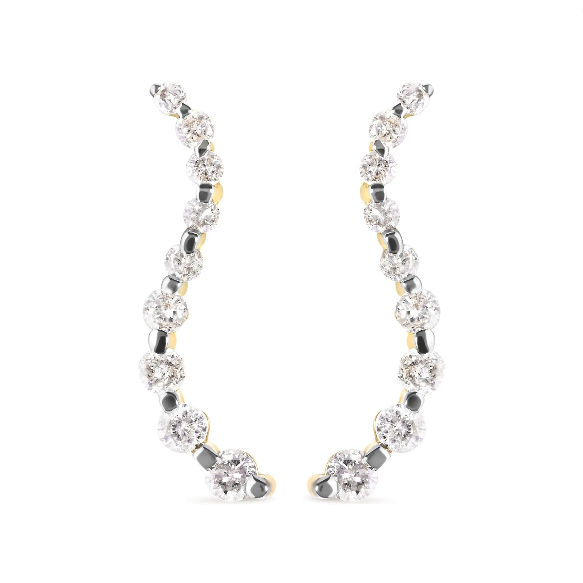Turn heads with this captivating pair of diamond journey earrings. The shapely s-wave design draws the eye down the length, featuring nine sparkling round diamonds in a prong setting which grow increasingly larger from top to bottom. These stud earrings feature diamonds of a total 1.00 cttw with an approximate I-J Color and I2-I3 Clarity. The genuine 14k yellow gold is a metal that will not tarnish for years to come. The push back findings keep these pierced earrings safe and secure on your ears.