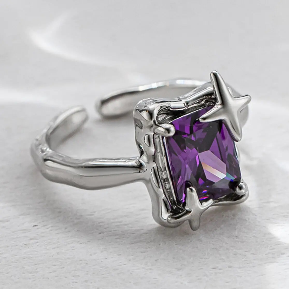 At its center lies a captivating purple cubic zirconia, adding a touch of sparkle and allure to your ensemble. The adjustable band ensures a comfortable and secure fit, allowing you to wear it with confidence on any occasion.